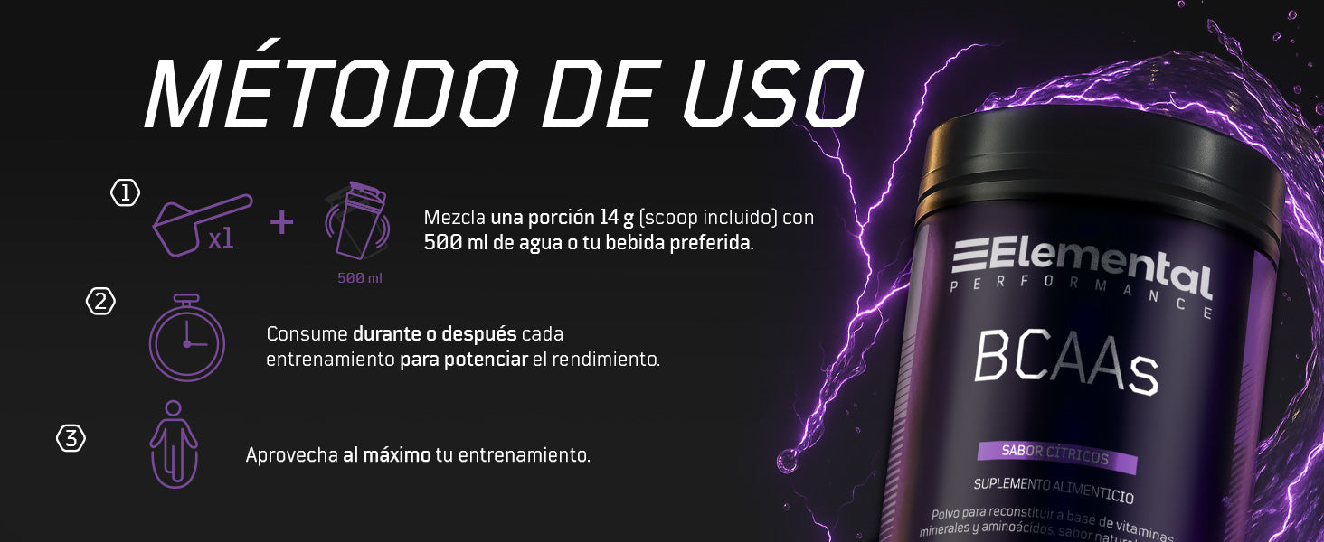 Mezclar 1 scoop (cucharada) en 350-500 ml de agua fría. Puedes consumirlo durante tu entrenamiento para mantenerte hidratado o después de finalizar para reponer líquidos y nutrientes.