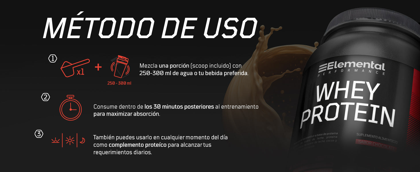 Mezcla una porción (scoop incluido) con 250-300 ml de agua, leche o tu bebida vegetal favorita. Es ideal para consumir después de tu entrenamiento o en cualquier momento del día para ayudarte a alcanzar tus objetivos de ingesta de proteína.